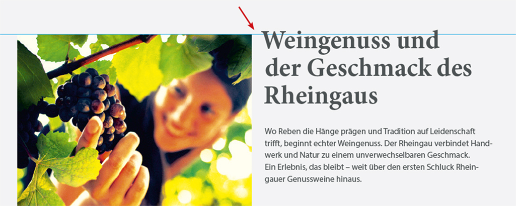 Abb. oben: Die Einstellung x-Höhe richtet den Text an den Oberkanten der Kleinbuchstaben (Gemeinen) sowie an der Satzspiegelkante aus. Dadurch entsteht zwischen Text- und Bildoberkante meist eine weniger harmonische optische Achse.