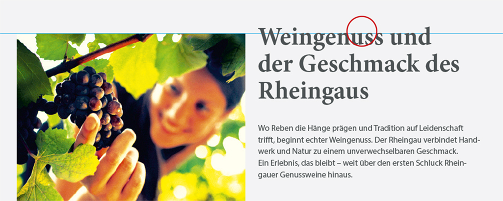 Abb. oben: Die Einstellung Versalhöhe richtet den Text an der Oberkante der Großbuchstaben (Versalien), wie hier im Beispiel am „W“, sowie an der Satzspiegelkante aus. Im Vergleich zur Ausrichtung an den Oberlängen der Schrift entsteht dadurch eine deutlich harmonischere optische Achse zwischen Text- und Bildoberkante.