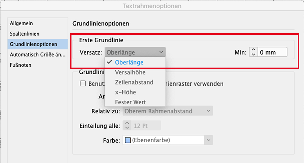 Objekt – Textrahmenoptionen – Grundlinienoptionen – Versatz – Erste Grundlinie – Oberlänge