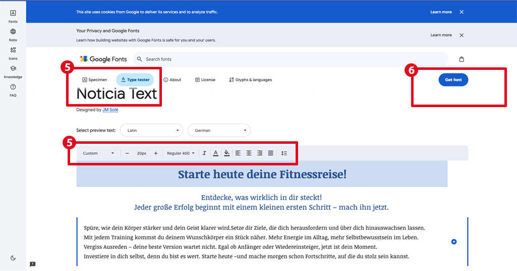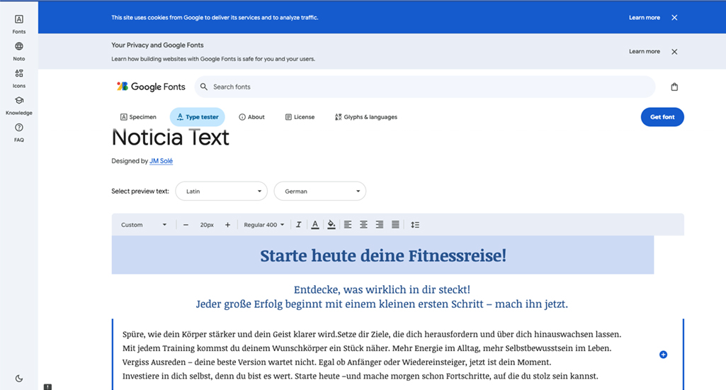 Nach dem Klick auf eine Schrift (hier im Beispiel Font Noticia Text) finden Sie oberhalb des Schriftnamens unter anderem die Funktionen Specimen, Type tester sowie Glyphs & languages. Mit der Funktion Type tester können Sie: